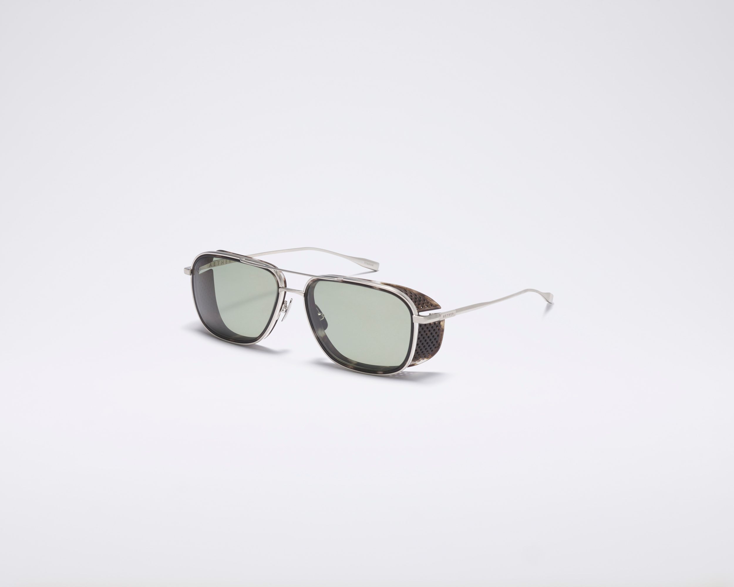 • Front 3/4 view of Summit Sunglass in Brushed Silver titanium with Grey Lens from AETHER Apparel.