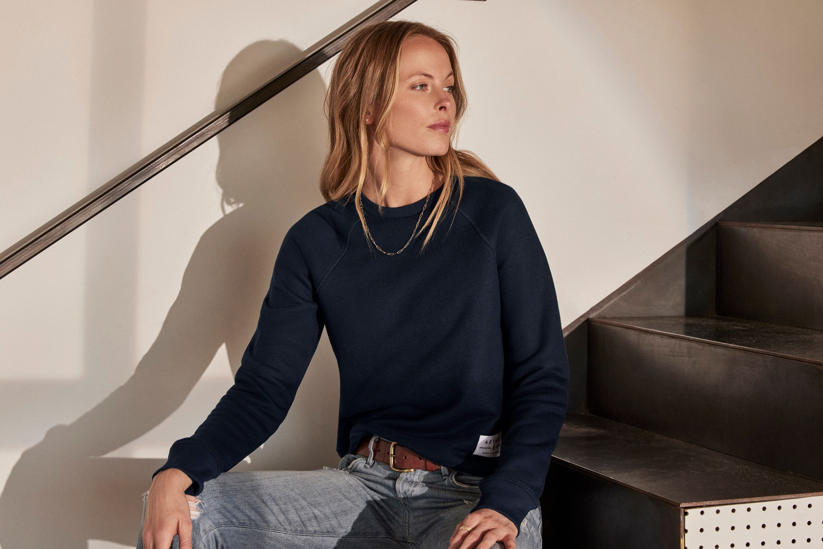 Small details like a coverstitch at the join seams and raglan sleeves help create a refined aesthetic. Additionally, there is rib knit at the neck, sleeves, and body-hem opening.