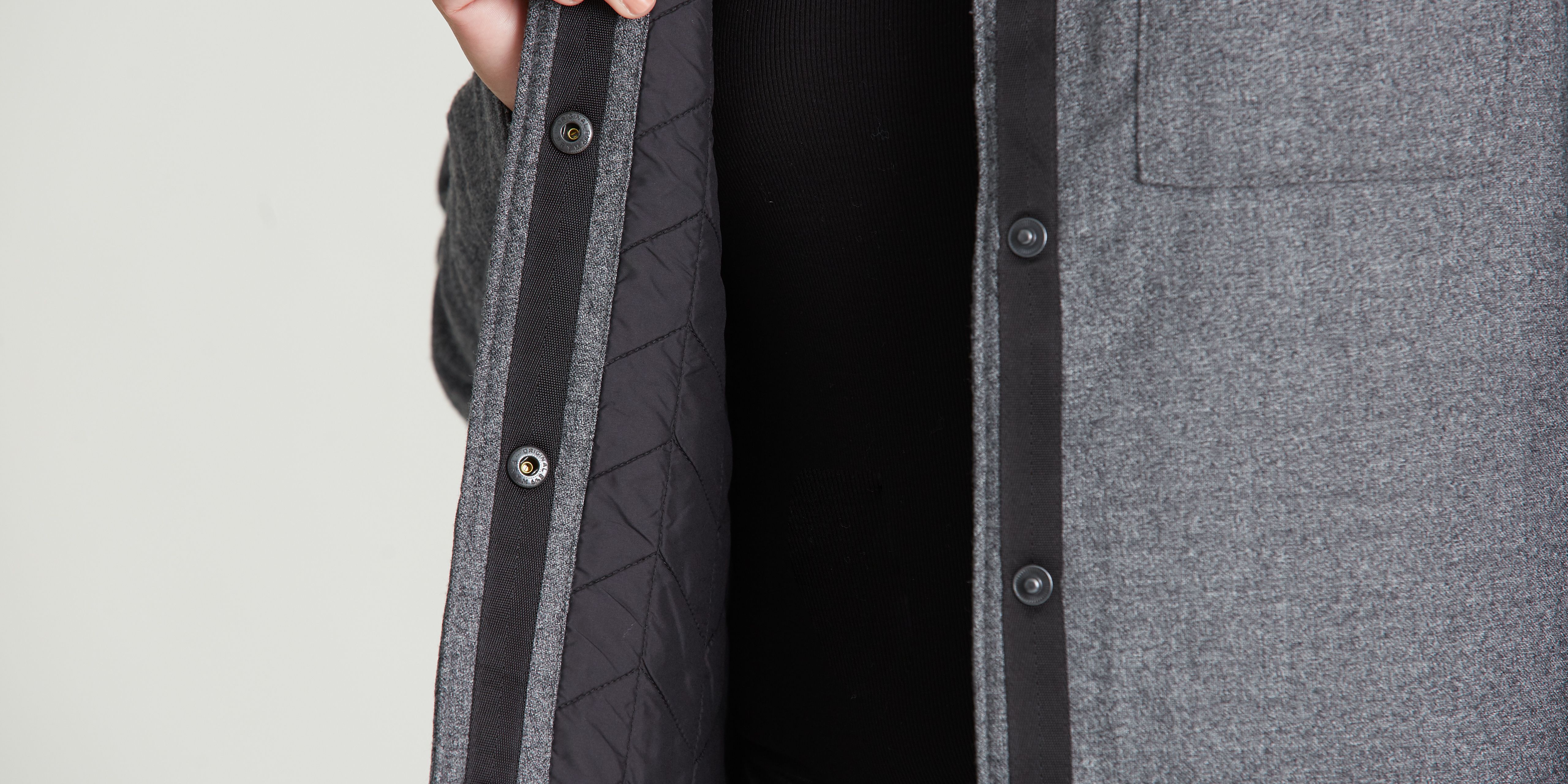 Thoughtful design details include herringbone webbing tape along the center-front placket and a custom quilting pattern on the interior.