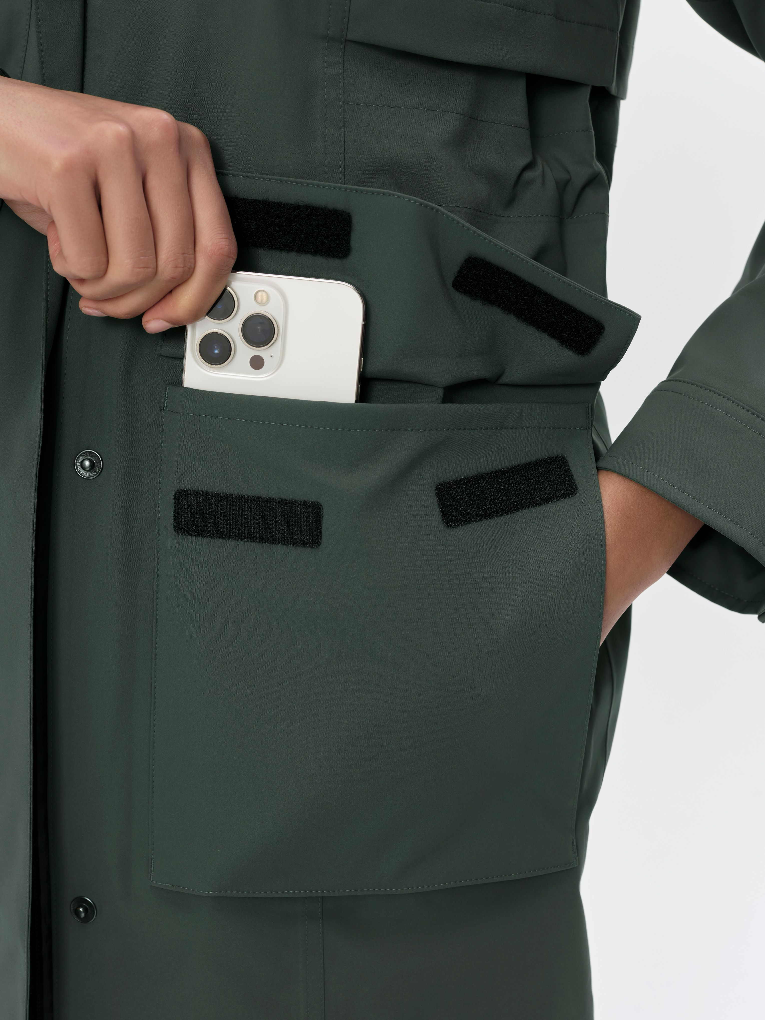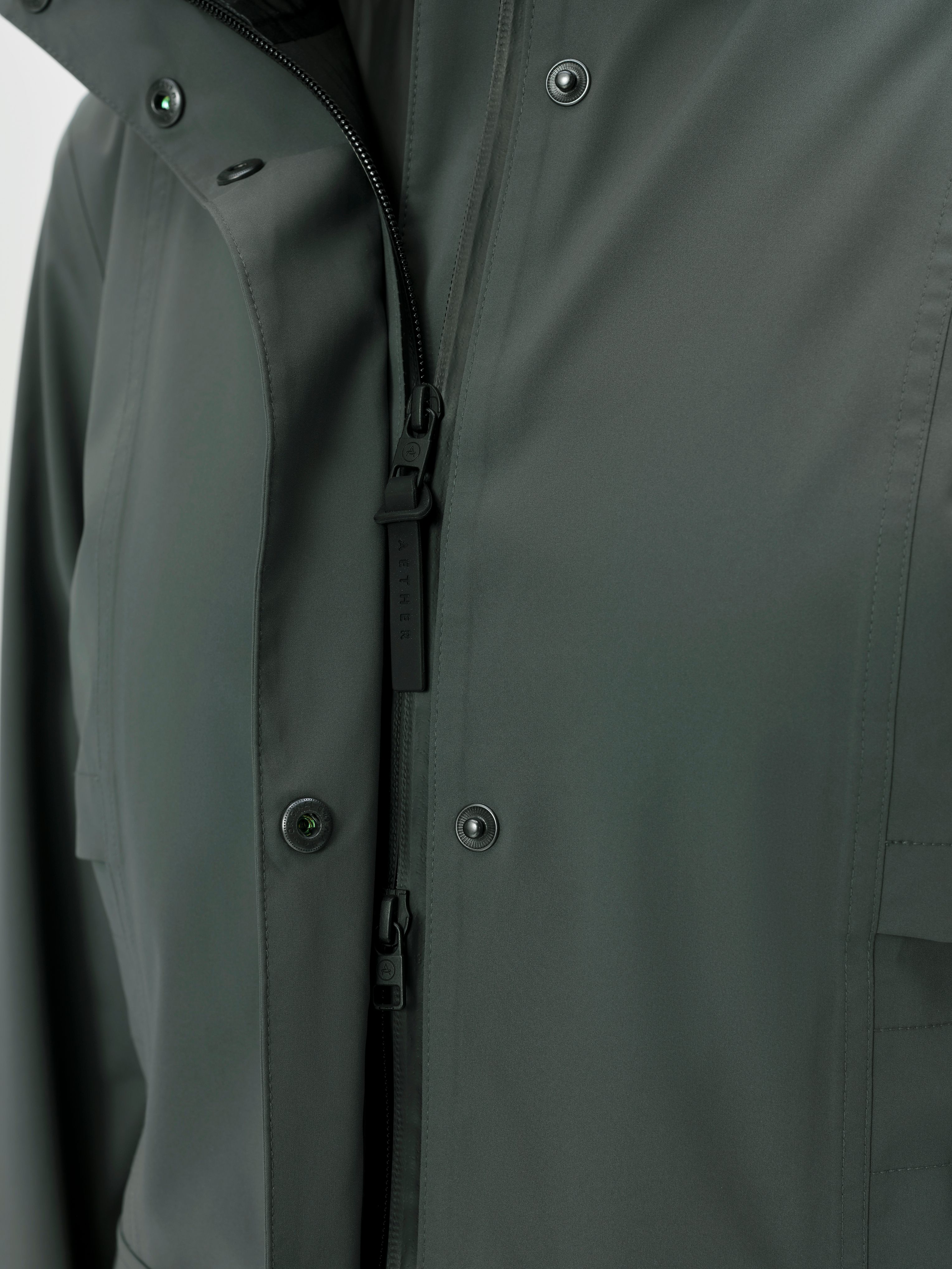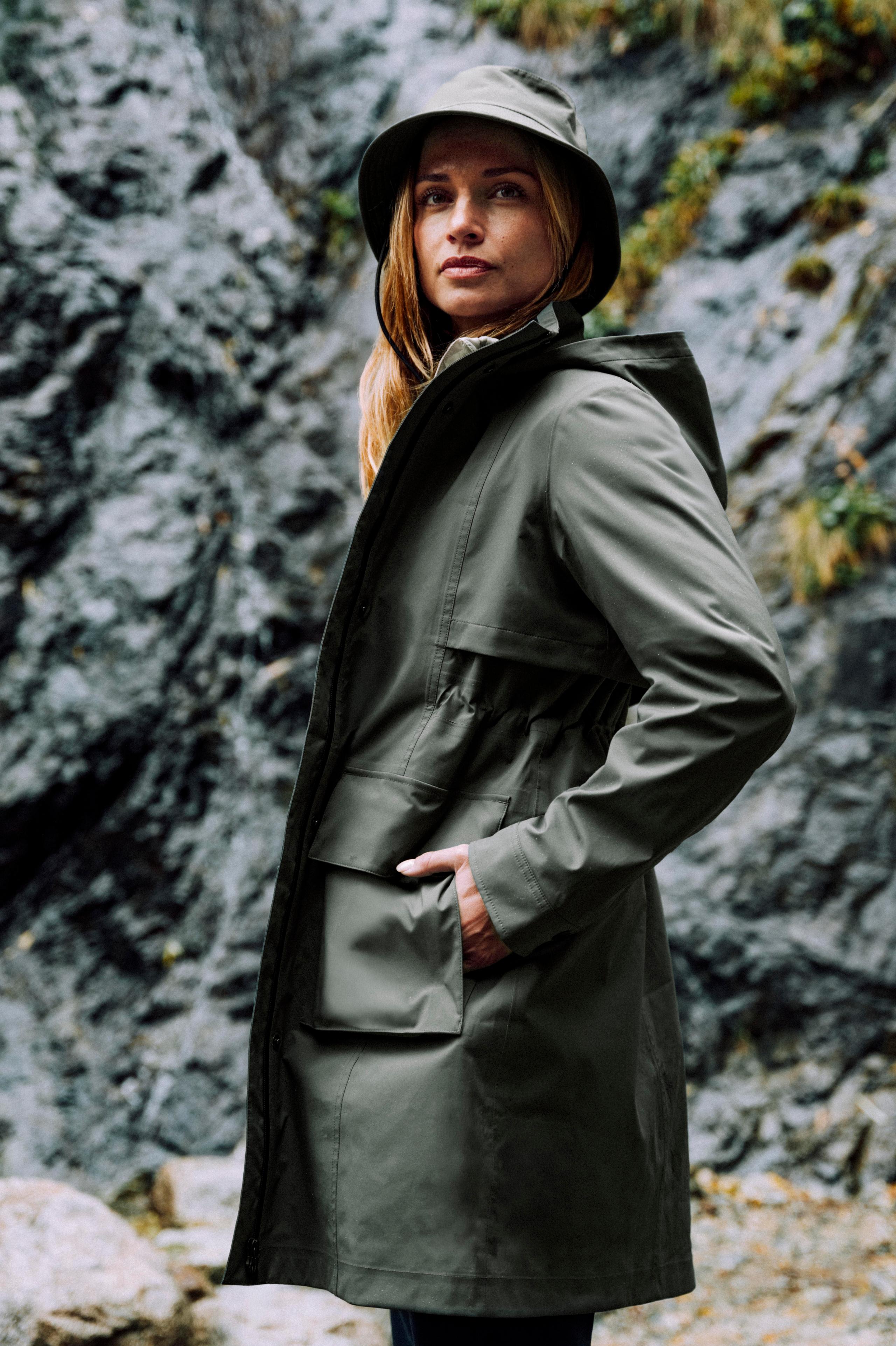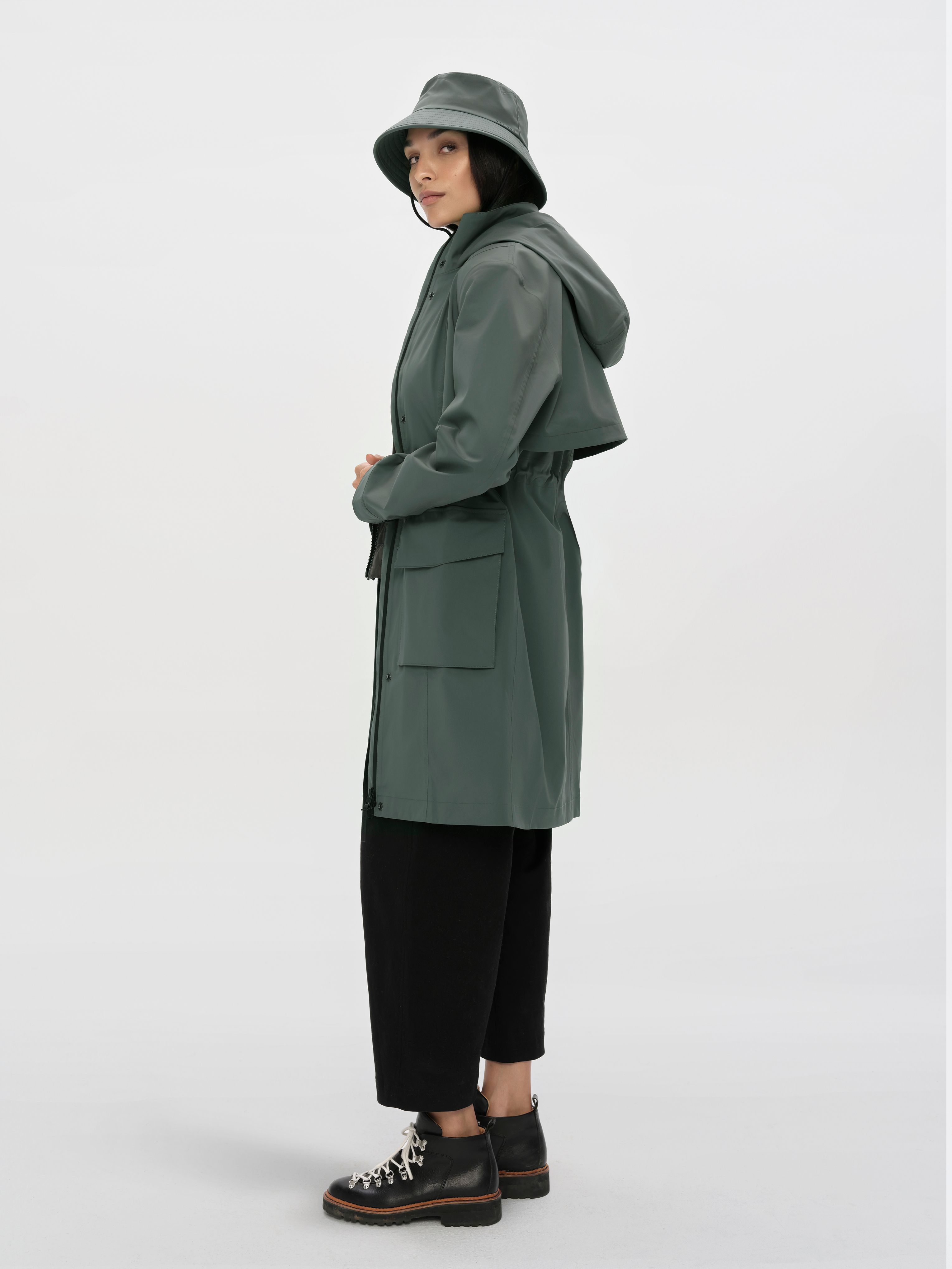 The top of the parka is capped off with a funnel neck collar with a brushed tricot lining, and a three-piece hood. The Wallace Rain Parka was also developed alongside the Wallace Bucket Hat — a matching, fully seam-sealed hat.