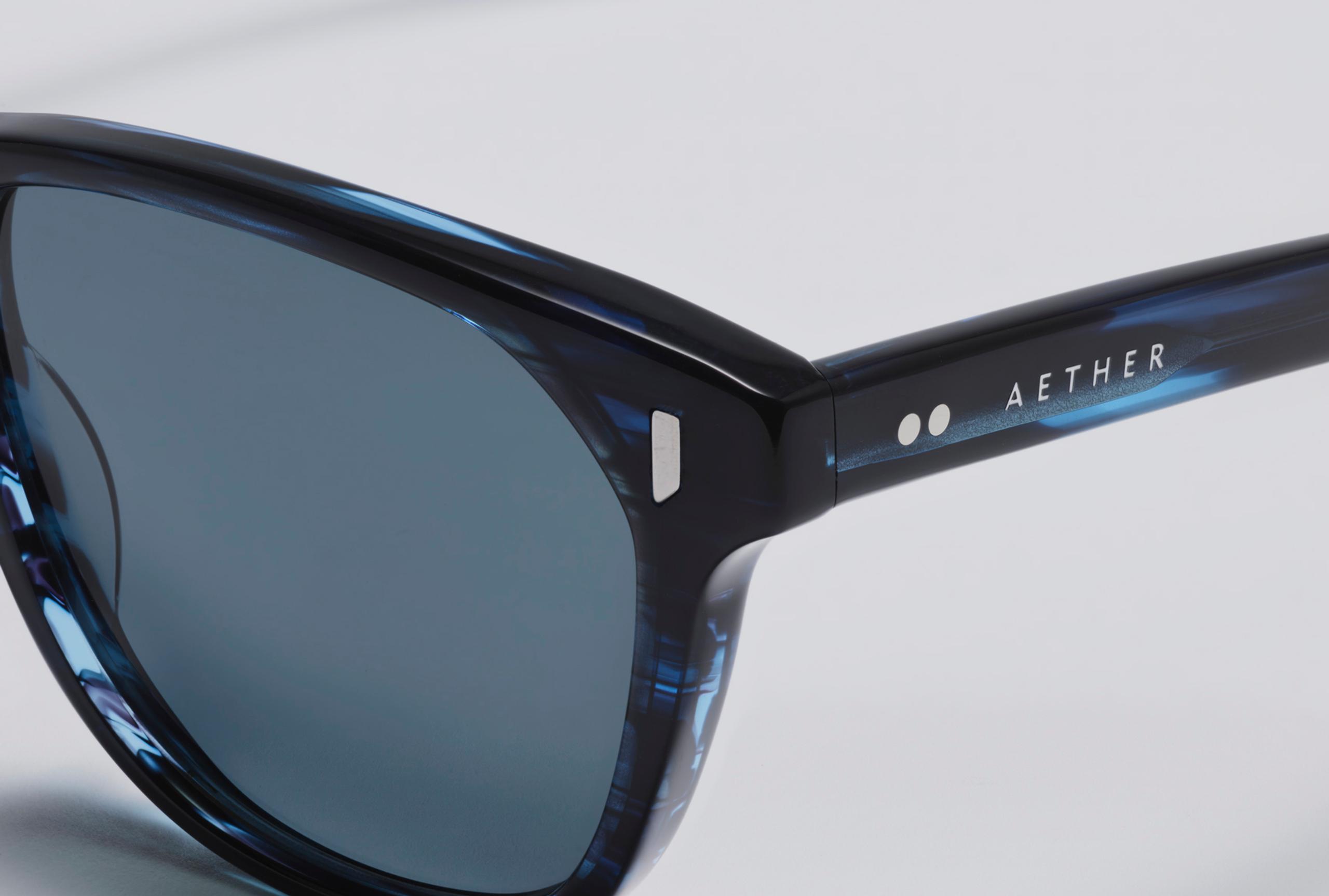 The frames are accented by custom plaques with metal riveted hinges for enhanced durability. The AETHER wordmark is engraved on the inside of the wearer’s right frame arm, while the AETHER logo is subtly engraved on the right lens, symbolizing our guaranteed lens quality. The AETHER logo also appears on the right temple tip; our mountain logo is heat stamped on the left tip.