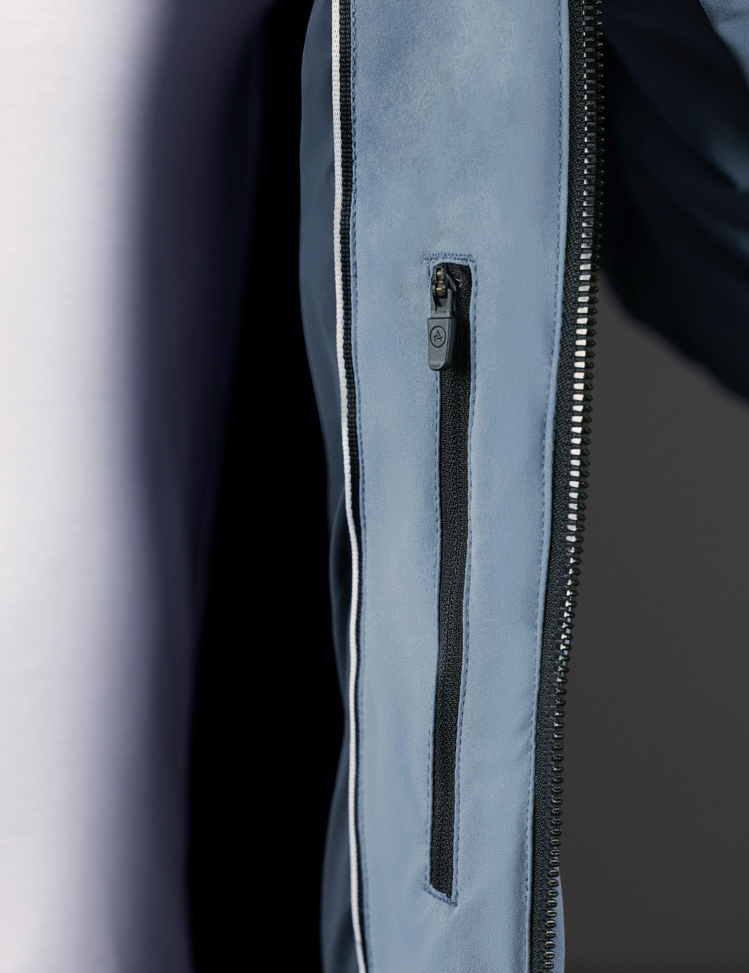Zippers at the chest, hand pockets, and sleeve cuffs