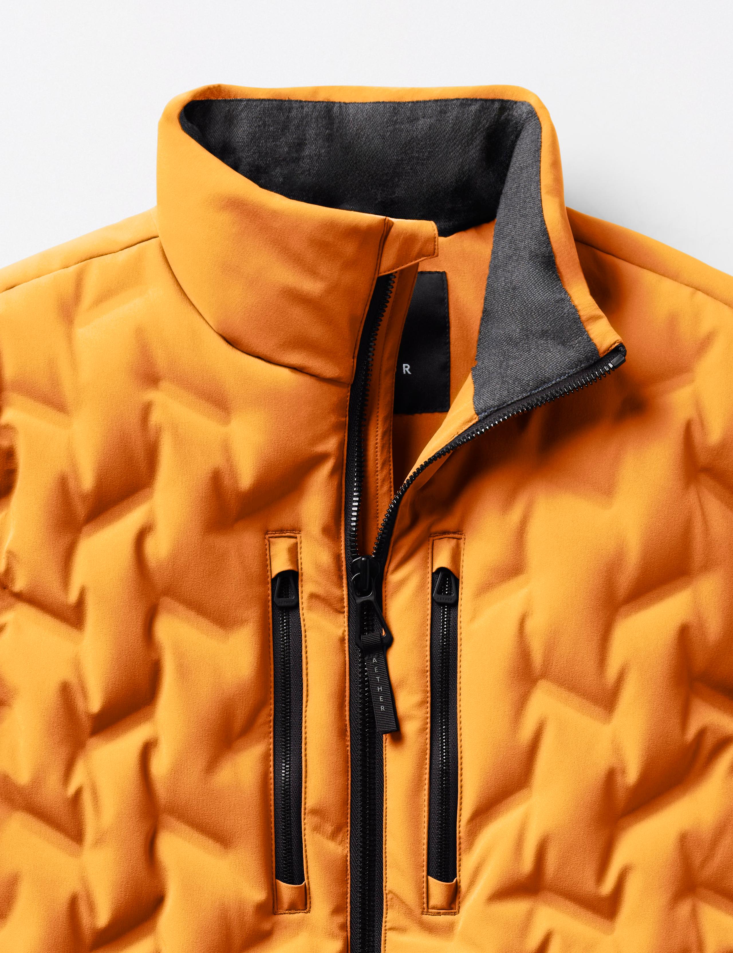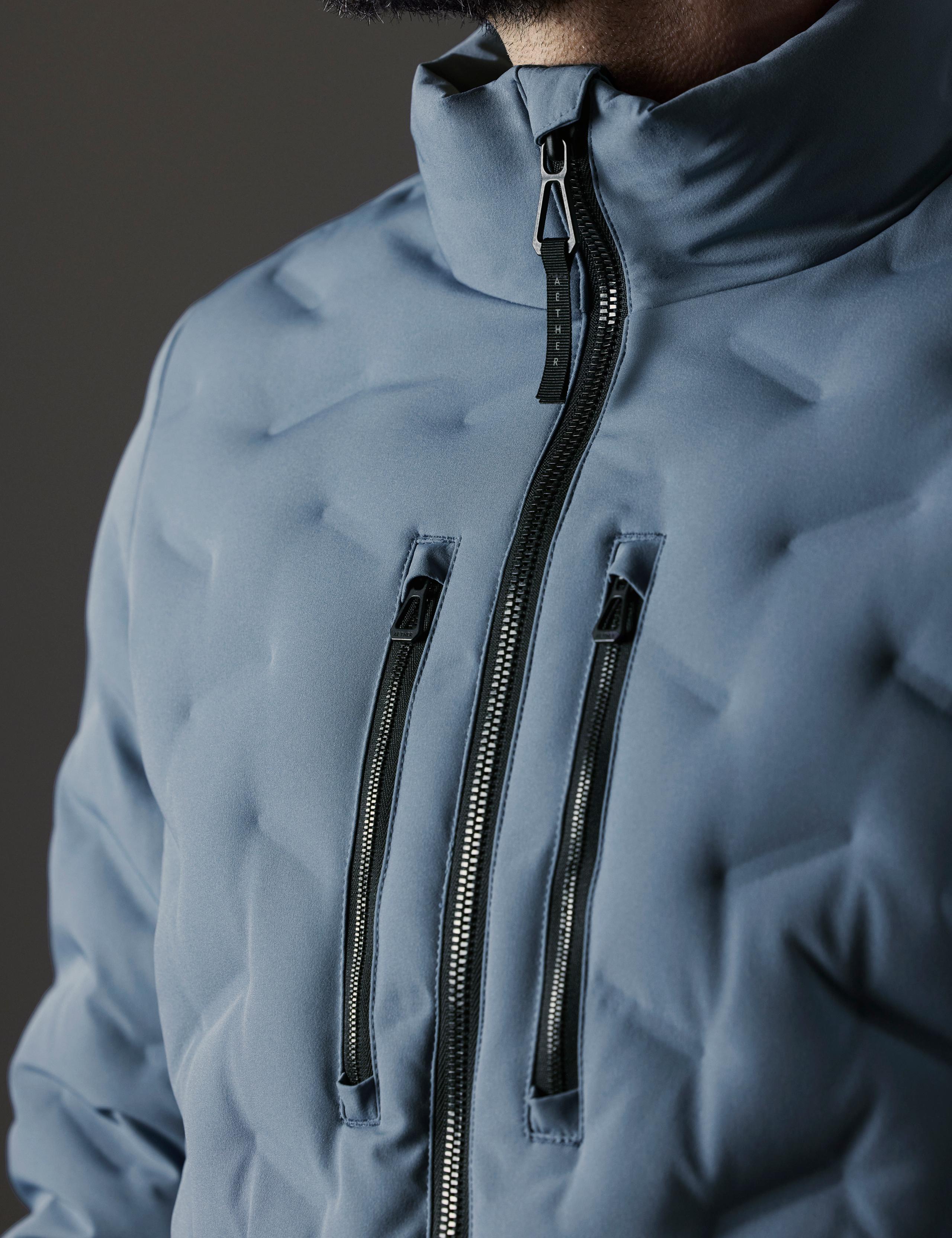 It features an AETHER-logo Natulon® zipper at the center front with zipper tape made from recycled bottles.